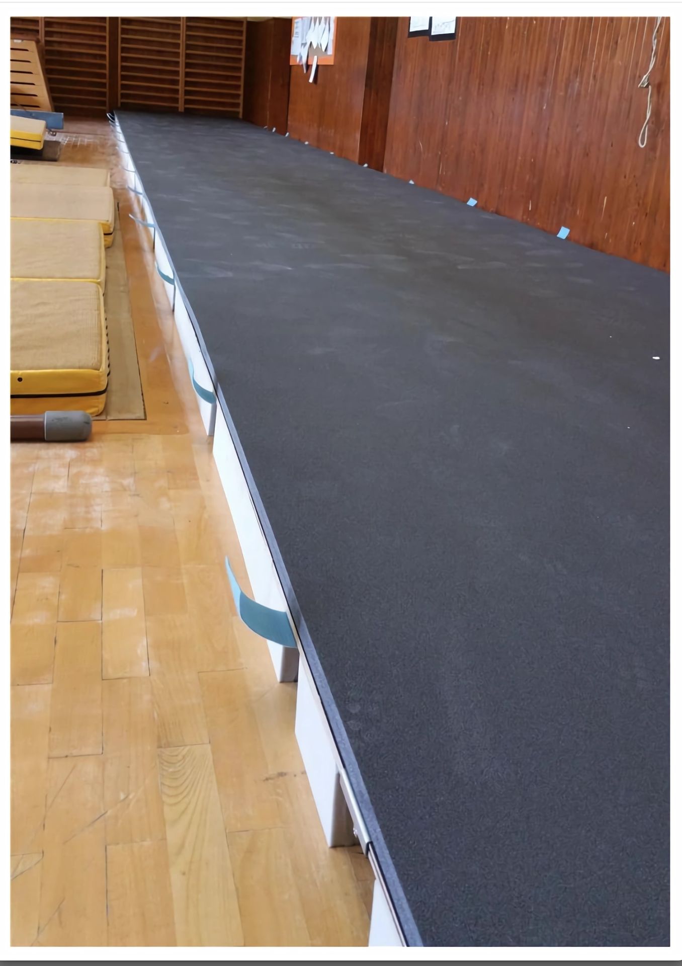 Die Schichtholzelemente sind mit den Maßen 200x125cm identisch wie bei der Bodenfl äche. 2 Rollen (1200 x 200 x 2,8cm) Spezialschaum- Zwischenaufl age dienen zur eff ektiveren Dämpfung und Absprungunterstützung. 1 Rollmatte (1200x200x1,5cm) mit hochwertigem Teppichvlies bilden den Abschluss. Die Gesamthöhe beträgt 20cm. Die Akrobatik-Bahn ist den Standardlängen 12m, 14m und 17m verfügbar. Andere Längen sind auf Anfrage möglich.